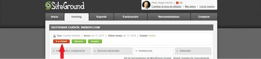 En su próxima pantalla, haga clic en la opción llamada Ir a cPanel. En este punto, se le abrirá una pantalla con diferentes opciones.