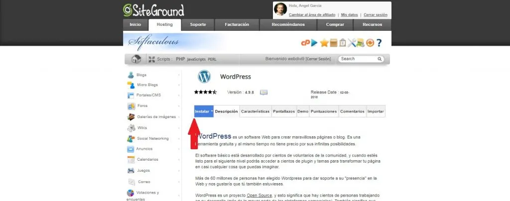 A continuación, serás redirigido a la siguiente pantalla, donde tendrás que hacer clic en la opción de instalación. Al hacer esto, Siteground ahora te guiará por todo el proceso de organización de tu cuenta de WordPress.